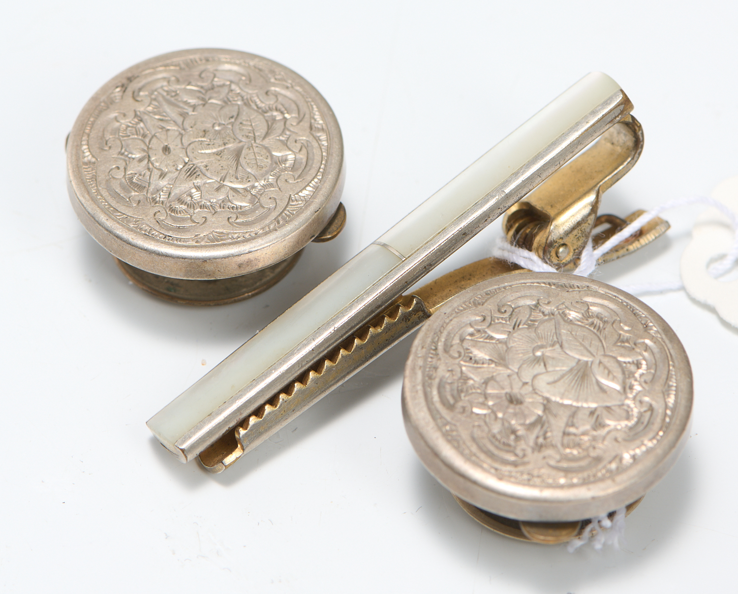 A VINTAGE MOTHER OF PEARL SET HAIR CLIP IN SILVER TONE METAL, ALONG WITH A PAIR OF BUTTONS IN CONTINENTAL SILVER