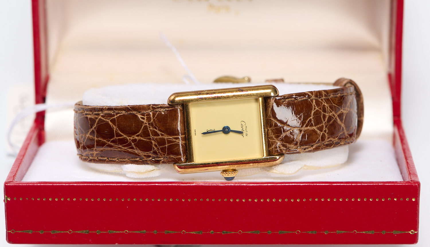 A TANK WRISTWATCH BY MUST DE CARTIER IN GOLD PLATED STERLING SILVER, FEATURING A BLUE BEADED CABOCHON CROWN AND LEATHER BAND, MANUAL WIND