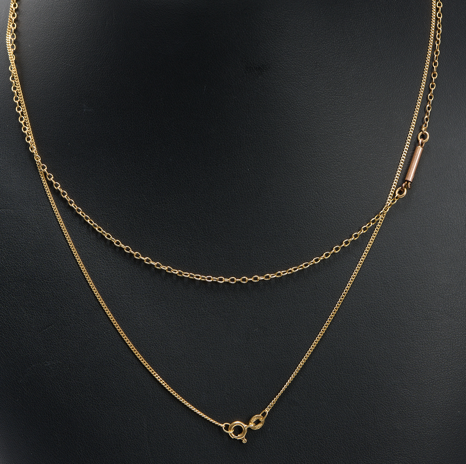 A VINTAGE CHAIN IN 14CT GOLD, TO A BARREL CLASP, APPROXIMATELY 425MM, 3.1GMS, ALONG WITH A CHAIN IN 18CT GOLD, APPROXIMATELY 500MM, 2.8GMS