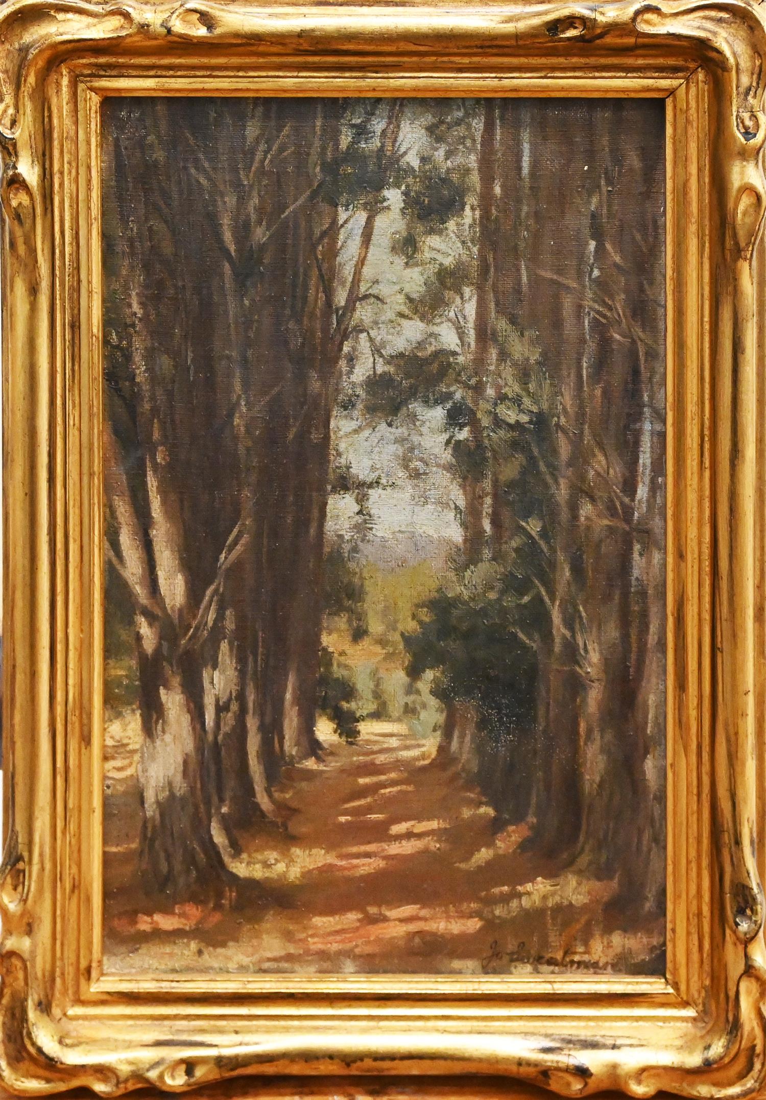 JO SWEATMAN, WOODED LANDSCAPE, OIL ON CANVAS ON BOARD, SIGNED LOWER RIGHT, 35 X 22CM
