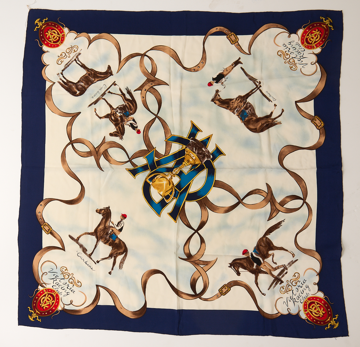 A VICTORIAN RACING CLUB SCARF - Featuring Melbourne Cup, race horse and jockey design, with hand rolled edge, 90cm square.