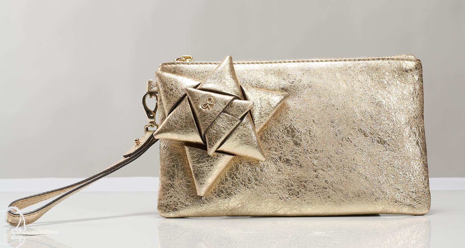 A SCROOGE CLUTCH BY ANYA HINDMARSH - Styled in metallic crinkled gold leather, with gift bow detail and optional wristlet 20 x 12cm.