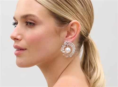 Each of an organic swirl design decorated at intervals with pear-shaped, princess and brilliant-cut diamonds, supporting a cultured pearl swing drop measuring approximately 14.00mm, the diamonds together stated to weigh 5.92 carats, length 40mm, signed Autore, post fittings.