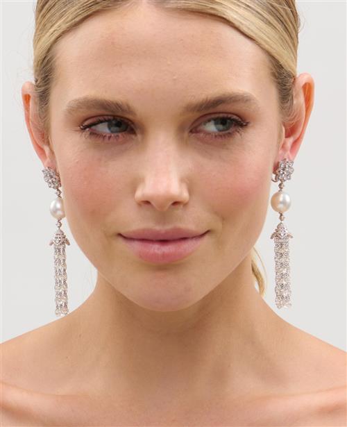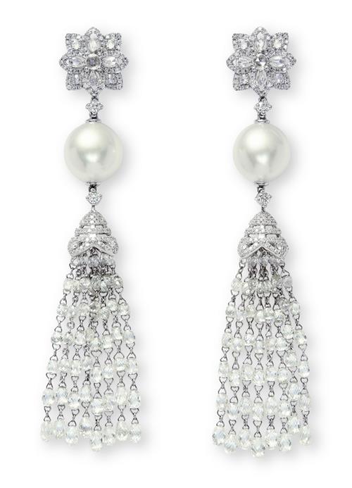 Terminating in an eight-line tassel of briolette diamonds supported from an openwork bell cap decorated with brilliant-cut diamonds surmounted by an openwork eight-pointed star decorated with rose and brilliant-cut diamonds between a 12.00mm cultured pearl and brilliant-cut diamond connectors, the diamonds together stated to weigh 21.54 carats, mounted in 18ct white gold, length 85mm, signed Autore, post and clip fittings.