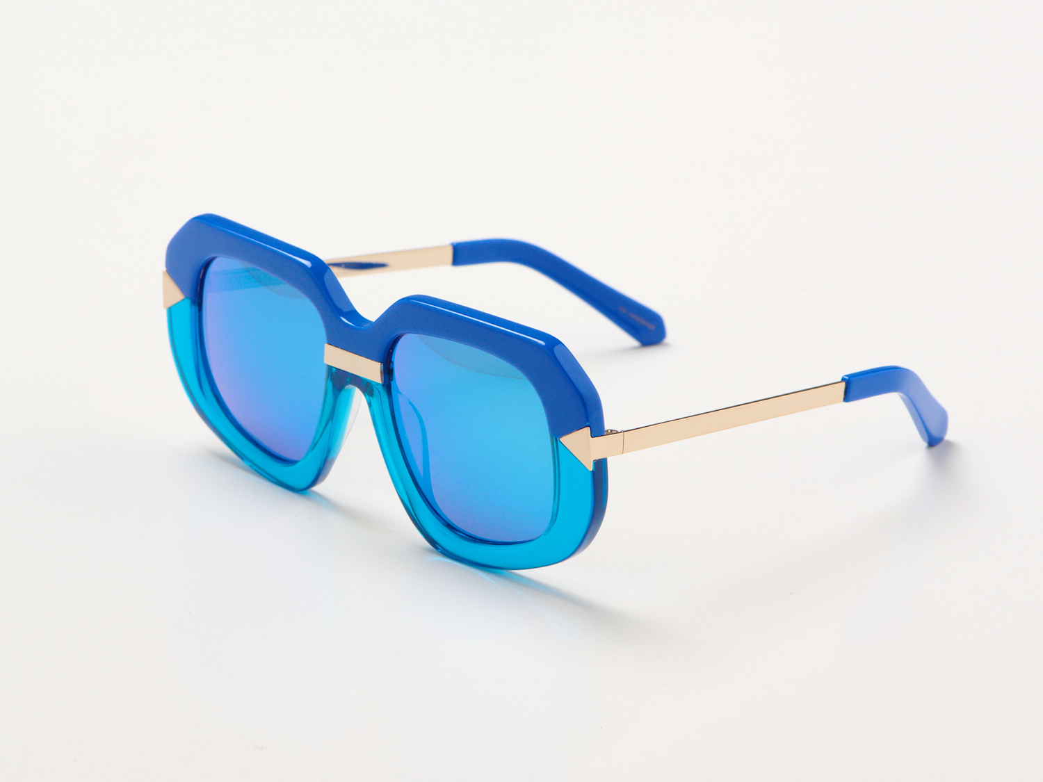 A PAIR OF HOLLYWOOD CREEPER SUNGLASSES BY KAREN WALKER - Styled in blue tone composite with blue tinted reflective lenses, and silver tone accents.