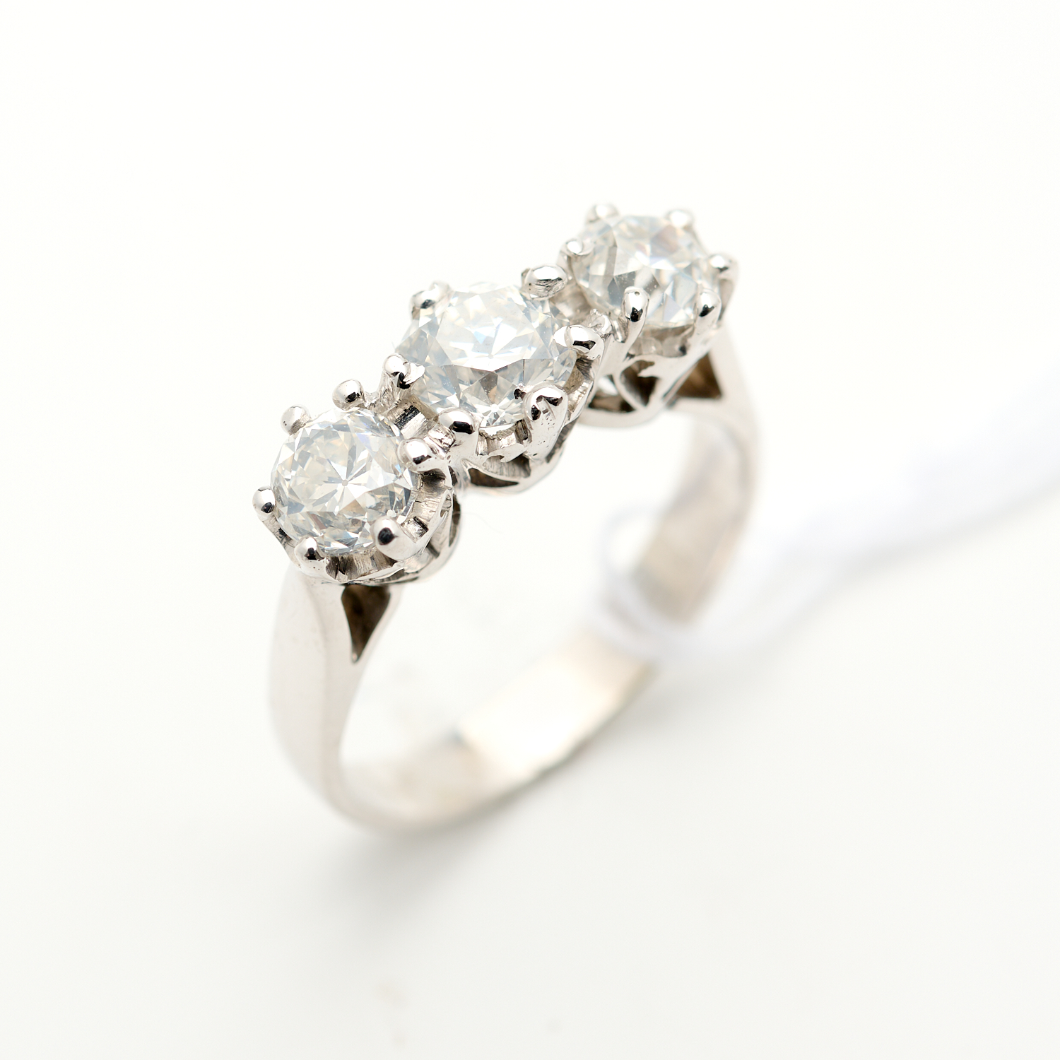 A THREE STONE DIAMOND RING IN WHITE GOLD, THE DIAMONDS TOTALLING 1.77CTS, RING SIZE M