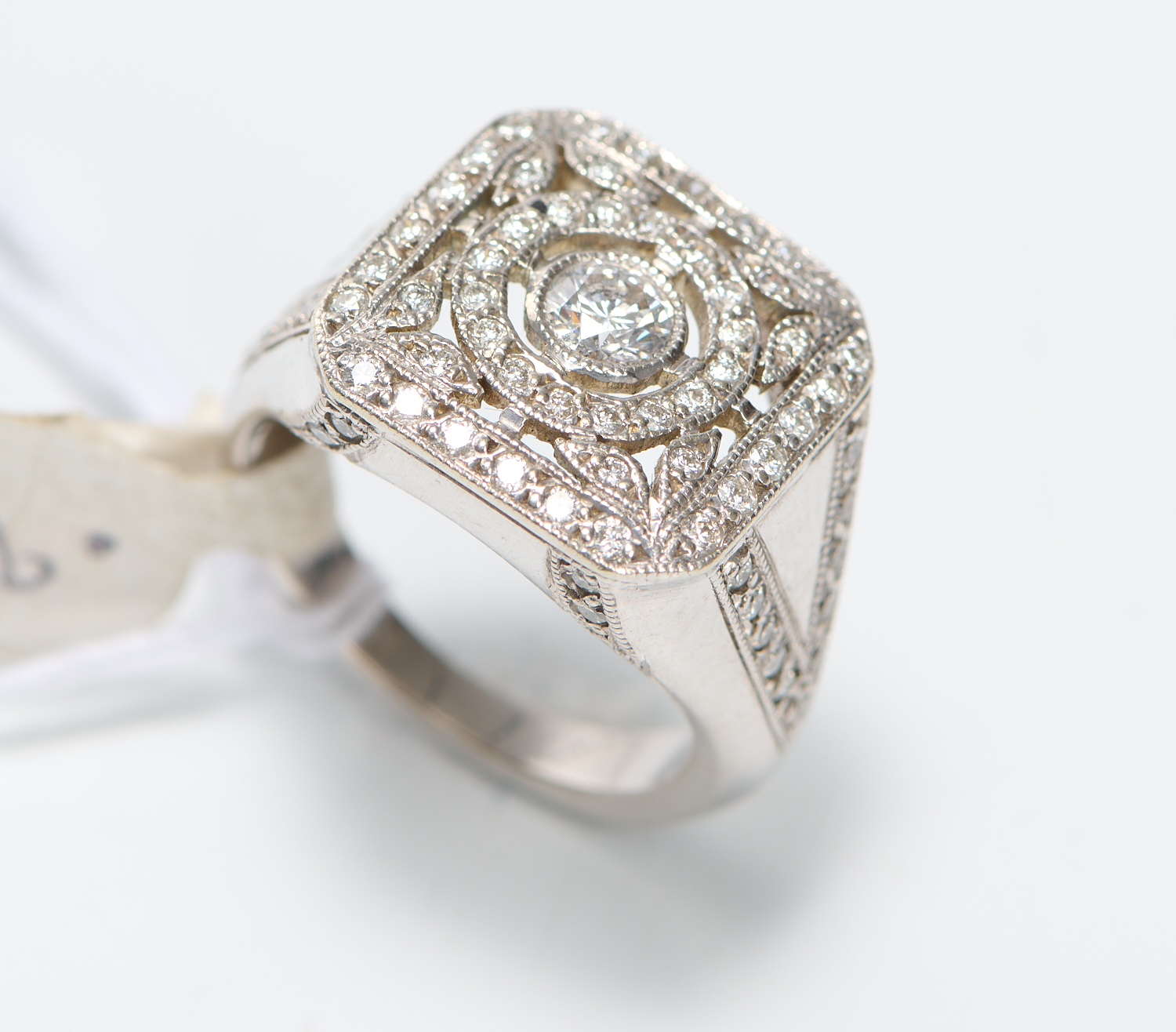 A DIAMOND SET RING IN 18CT WHITE GOLD, CENTRING A CLAW-SET ROUND BRILLIANT-CUT DIAMOND WEIGHING 1.22 CARATS, FLANKED BY FURTHER BRIL...