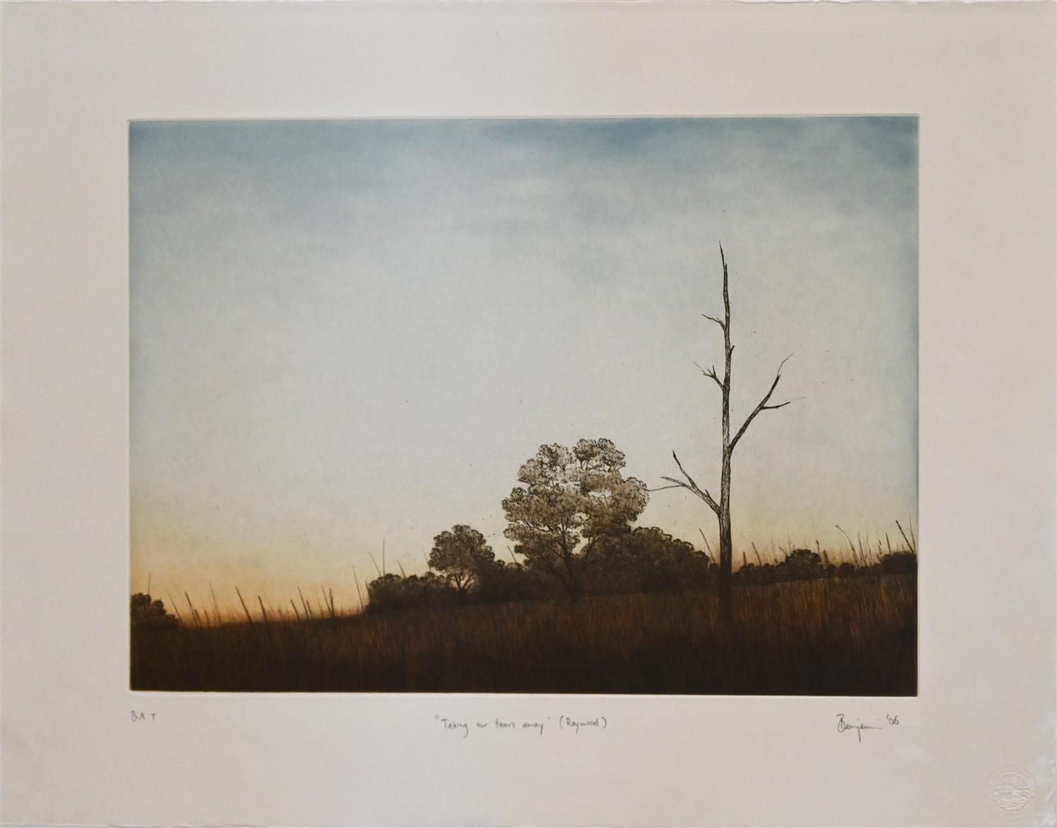 JASON BENJAMIN, 'TAKING OUR TEARS AWAY' (RAYWOOD) 2006, ETCHING BAT, 40 X 57CM (IMAGE)
