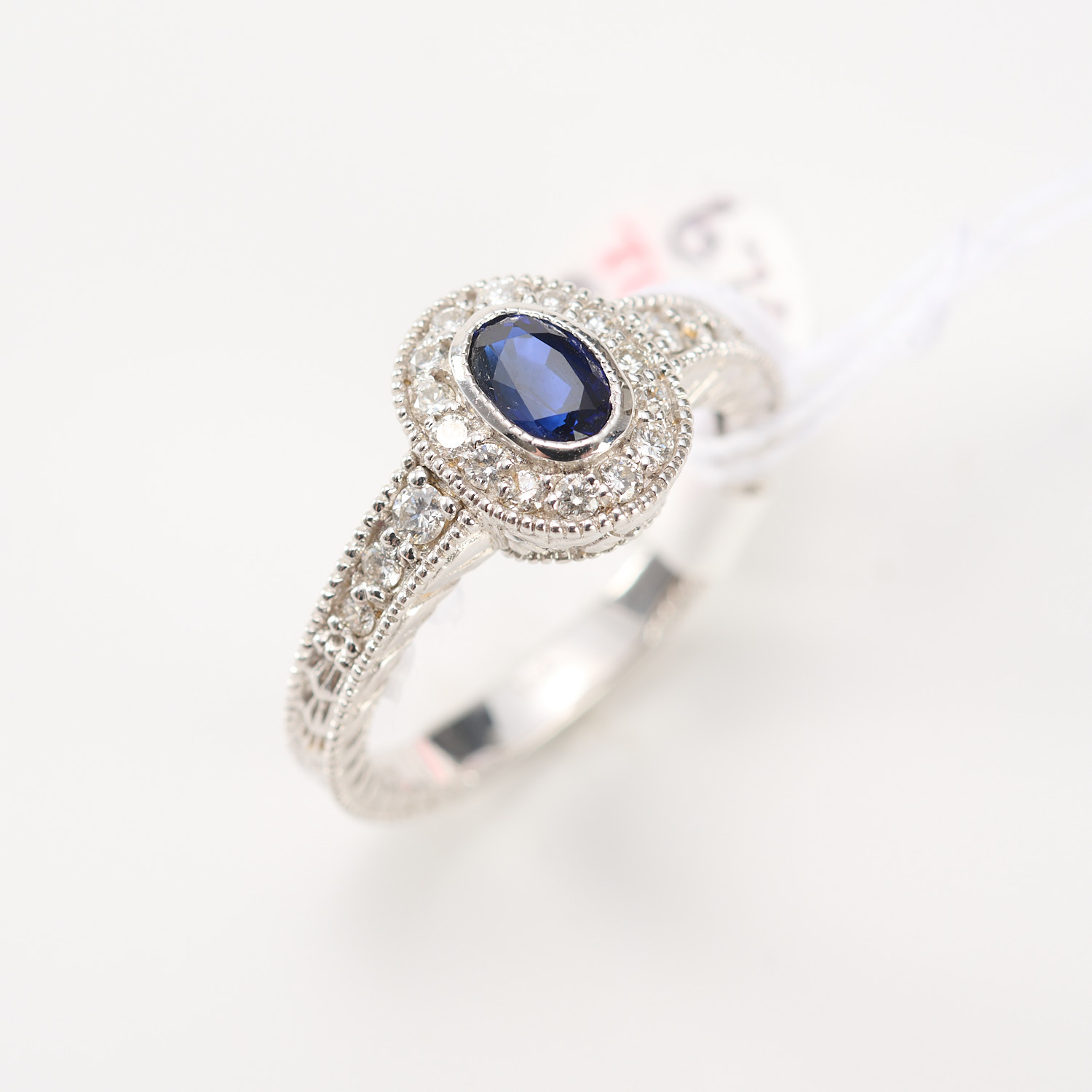 A SAPPHIRE AND DIAMOND SET RING IN 18CT WHITE GOLD, THE CENTRAL OVAL CUT SAPPHIRE MEASURING 0.68CTS, WITH SURROUNDING DIAMONDS TOTALLING 0.35CTS, RING SIZE N/O