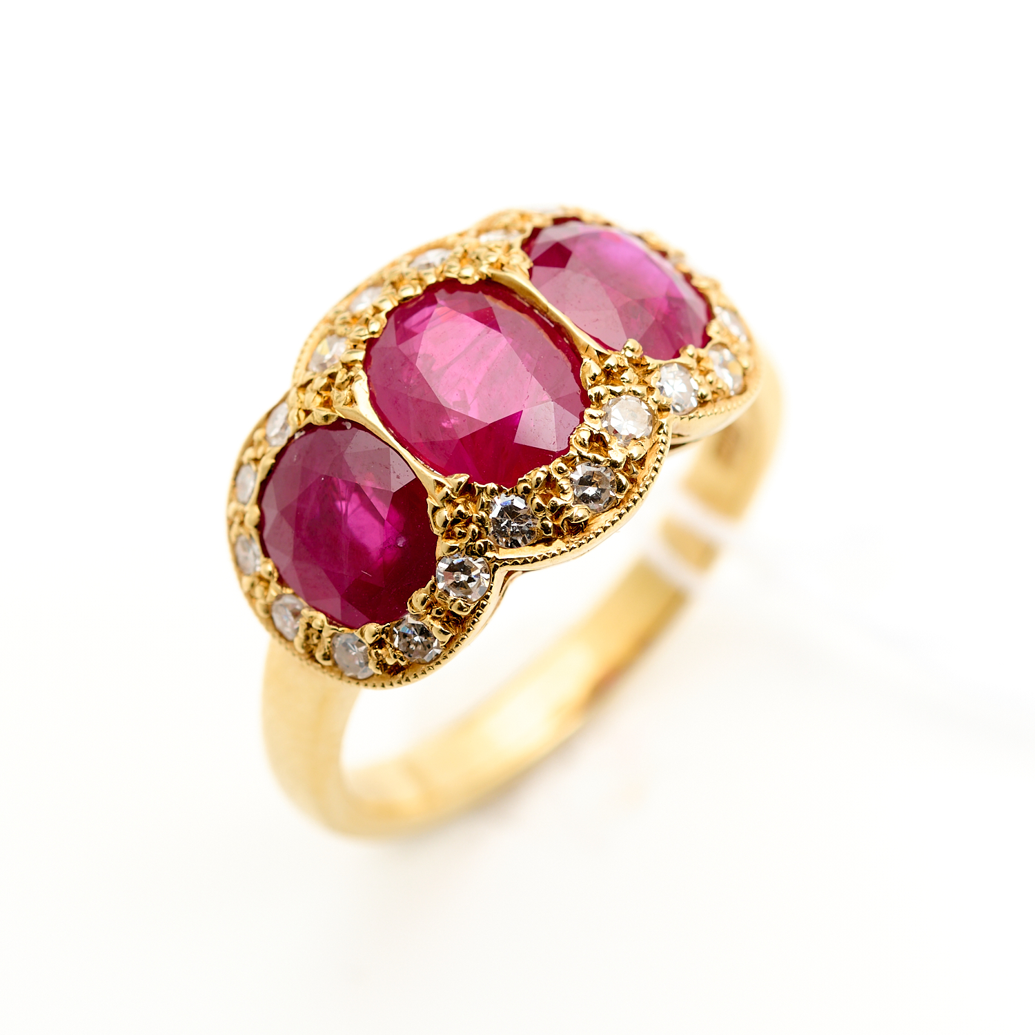 A RUBY AND DIAMOND SET RING IN 18CT GOLD, THE CENTRAL RUBY MEASURING 7MM X 6MM, THE SURROUNDING RUBIES MEASURING 6MM X 5MM, RING SIZE M, 5.6GMS
