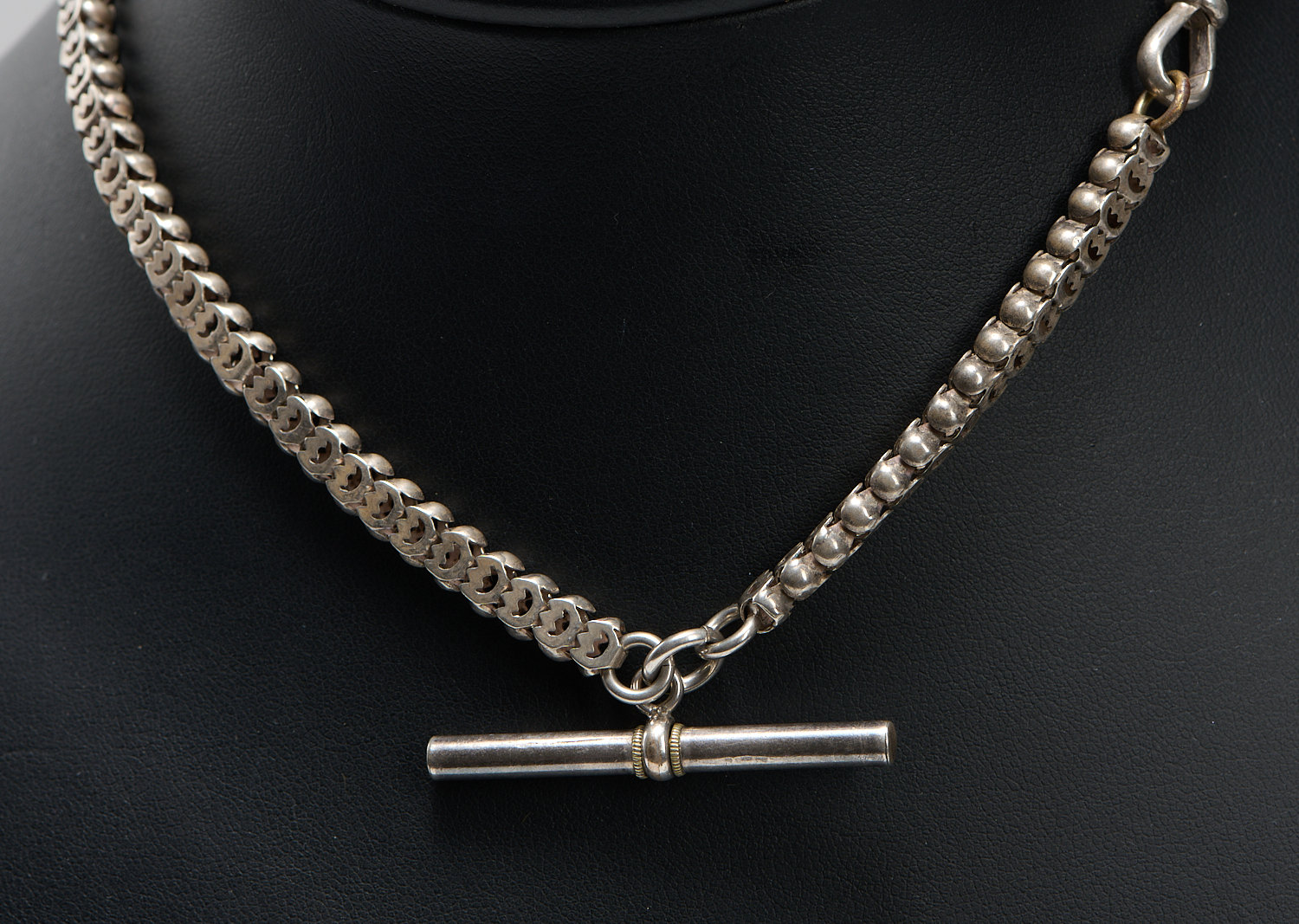 AN ANTIQUE ALBERT CHAIN IN SILVER, LENGTH 370MM