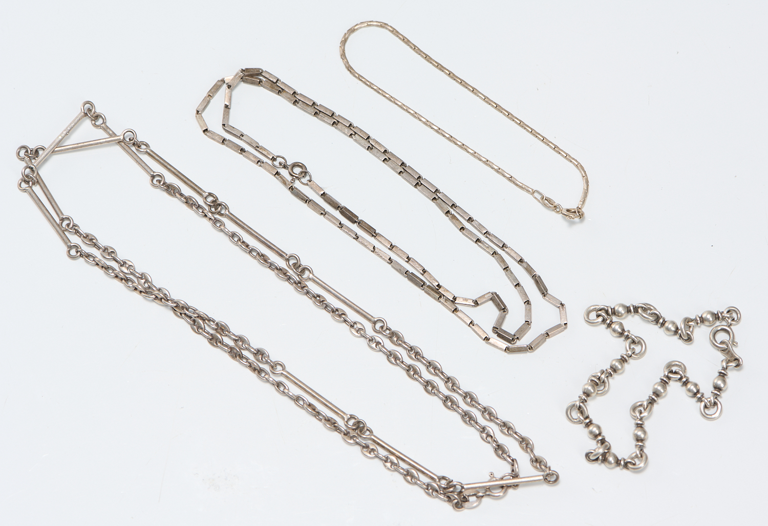 TWO FANCY LINK CHAINS AND TWO BRACELETS IN STERLING SILVER, LENGTHS 720MM, 510MM, 190MM AND 180MM