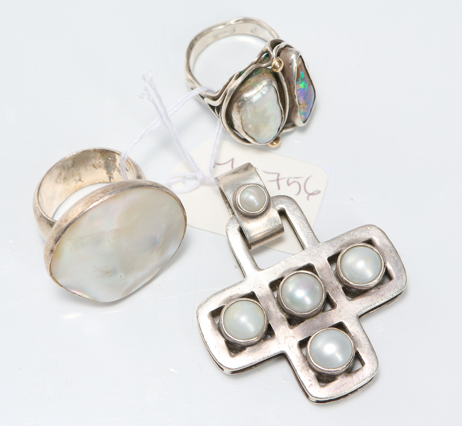 A COLLECTION OF MOTHER OF PEARL AND BOULDER OPAL SET JEWELLERY IN STERLING SILVER INCLUDING TWO RINGS (WITH BOLDER OPAL SIZE N, WITHOUT SIZE Q) AND A CROSS PENDANT (42MM X 42MM FROM BAIL)