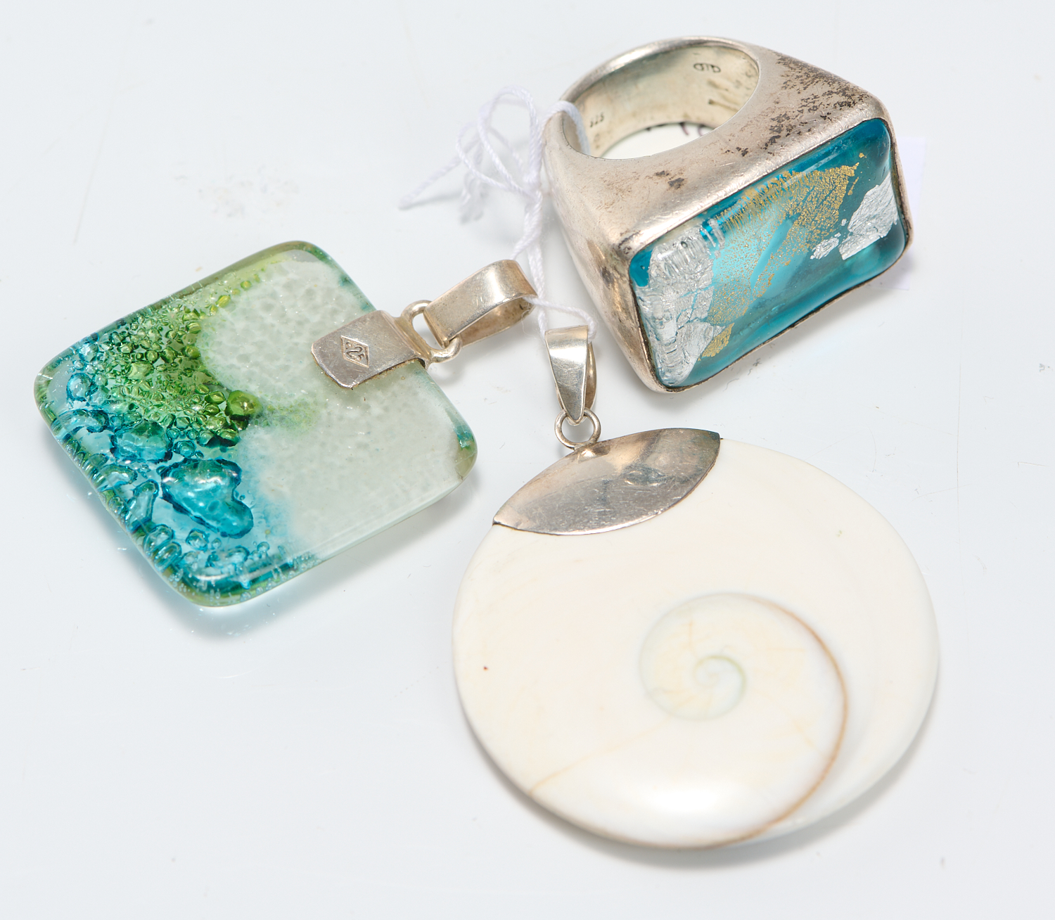 A VENETIAN GLASS STYLE SET RING (SIZE O) AND PENDANT (31MM X 31MM FROM BAIL) IN STERLING SILVER AND A ORGANIC SHELL SET PENDANT (DIAMETER 42MM) TO A STERLING SILVER BAIL