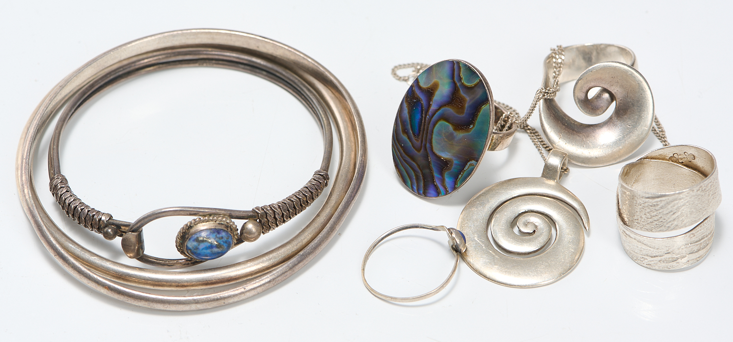 A COLLECTION OF JEWELLERY IN STERLING SILVER INCLUDING A RING OF 'SWIRL' DESIGN BY GEORG JENSEN (SIZE K), A PAUA SET RING (SIZE N), A 'RIBBON' RING (SIZE P), A LAPIS SET RING (SIZE Q), THREE BANGLES AND A NECKLACE