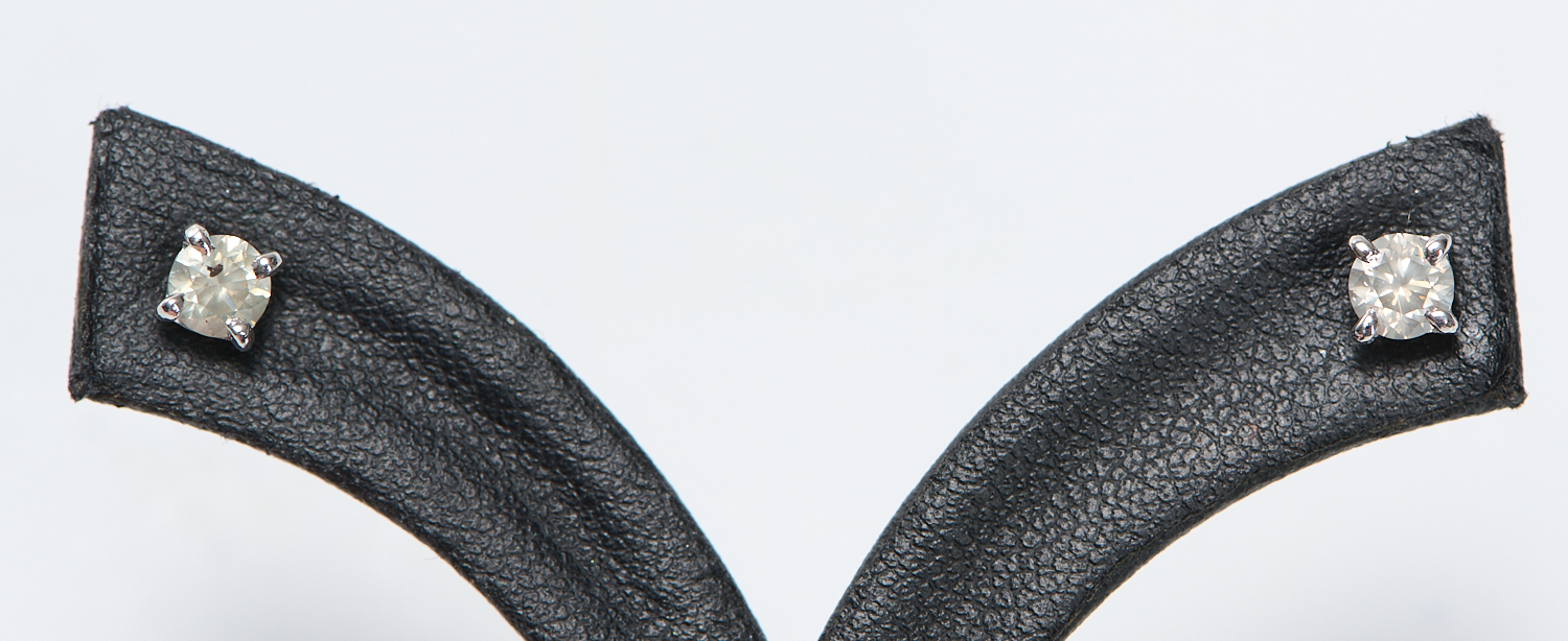 A PAIR OF DIAMOND EARRINGS IN 18CT WHITE GOLD TO STUD FITTINGS, THE DIAMOND TOTALLING 0.68CTS