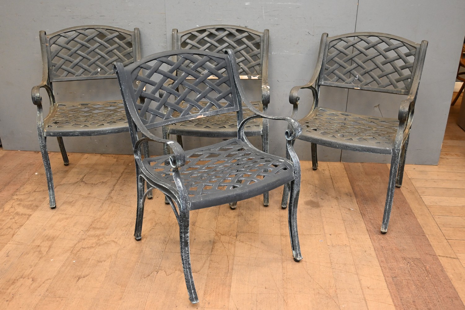 A SET OF FOUR OUTDOOR CHAIRS WITH LATTICE SEATS AND BACKS (A/F) (85H X 56W X 60D CM) (PLEASE NOTE THIS HEAVY ITEM MUST BE REMOVED BY CARRIERS AT THE CUSTOMER'S EXPENSE. LEONARD JOEL STAFF CANNOT ASSIST CARRYING THIS ITEM) (X-LARGE ITEM)
