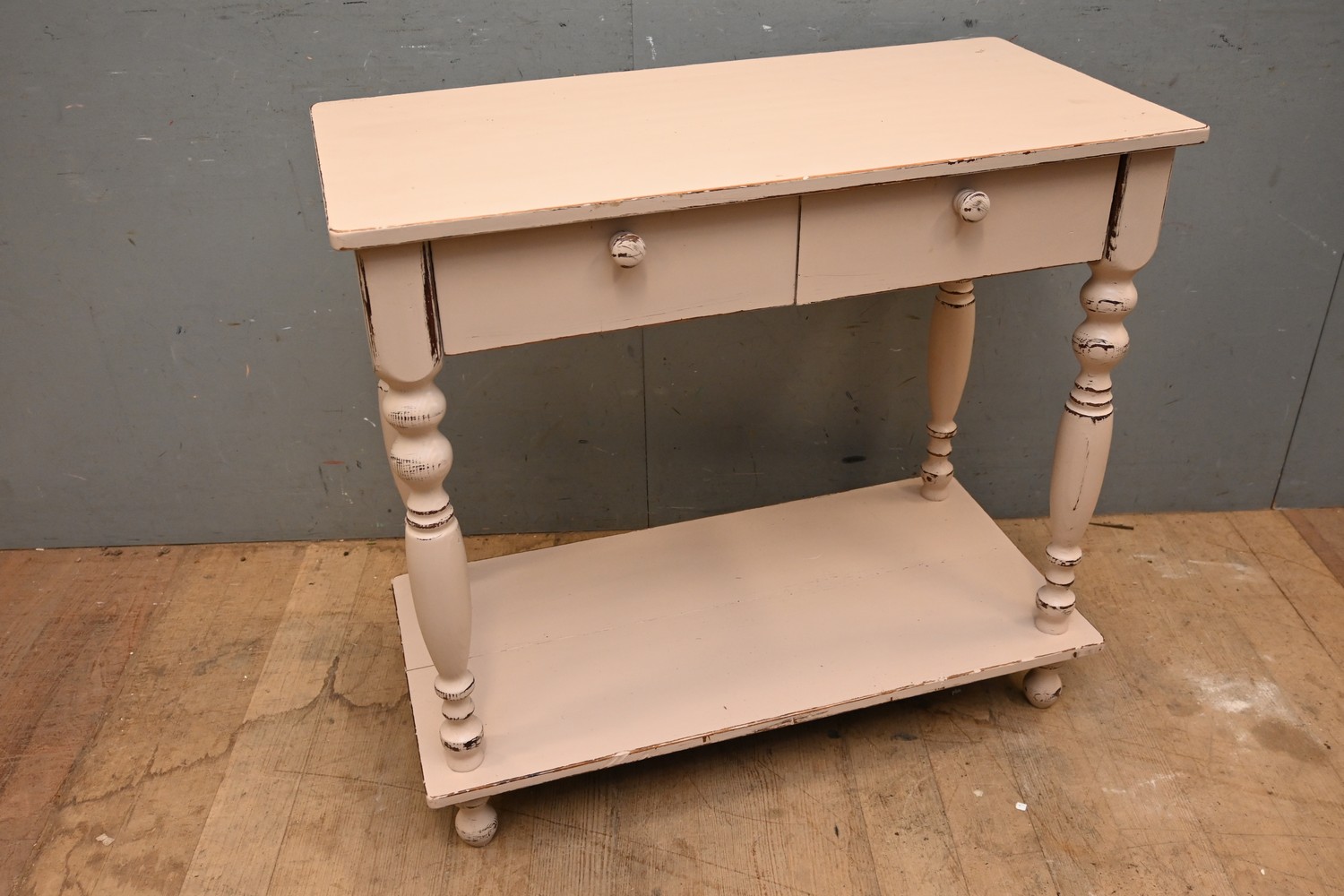A PAINTED HARDWOOD TWO DRAWER HALL TABLE (A/F) (85H X 92W X 46D CM) (LEONARD JOEL DELIVERY SIZE: LARGE)