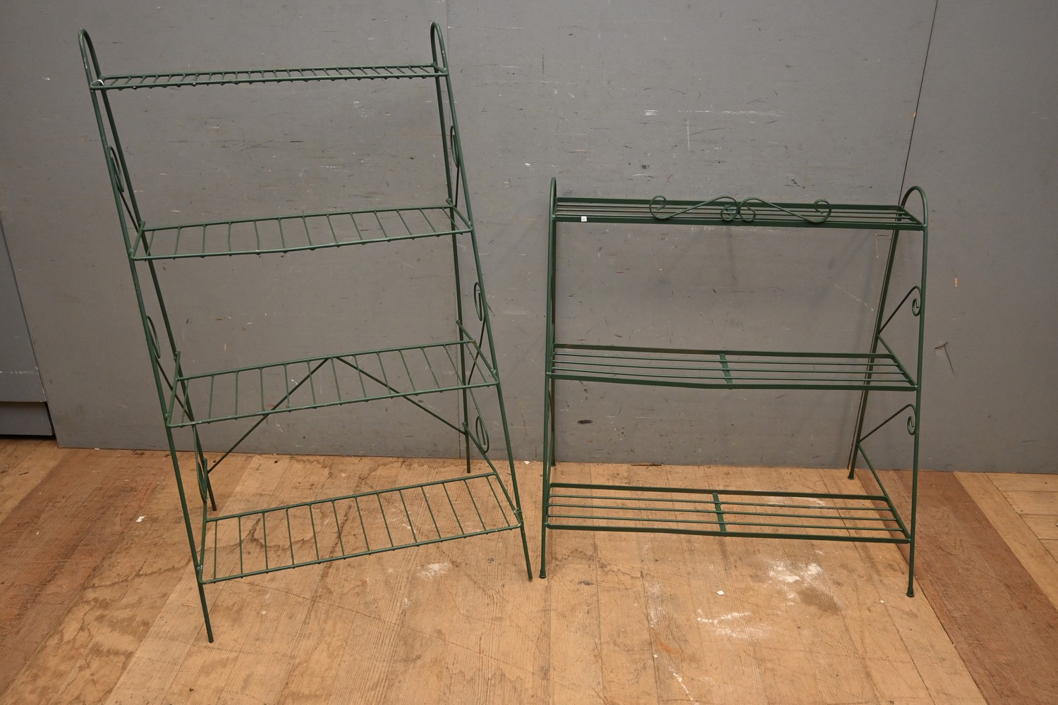 TWO GREEN PAINTED METAL PLANT STANDS (120H X 71W X52D CM) (LEONARD JOEL DELIVERY SIZE: LARGE)