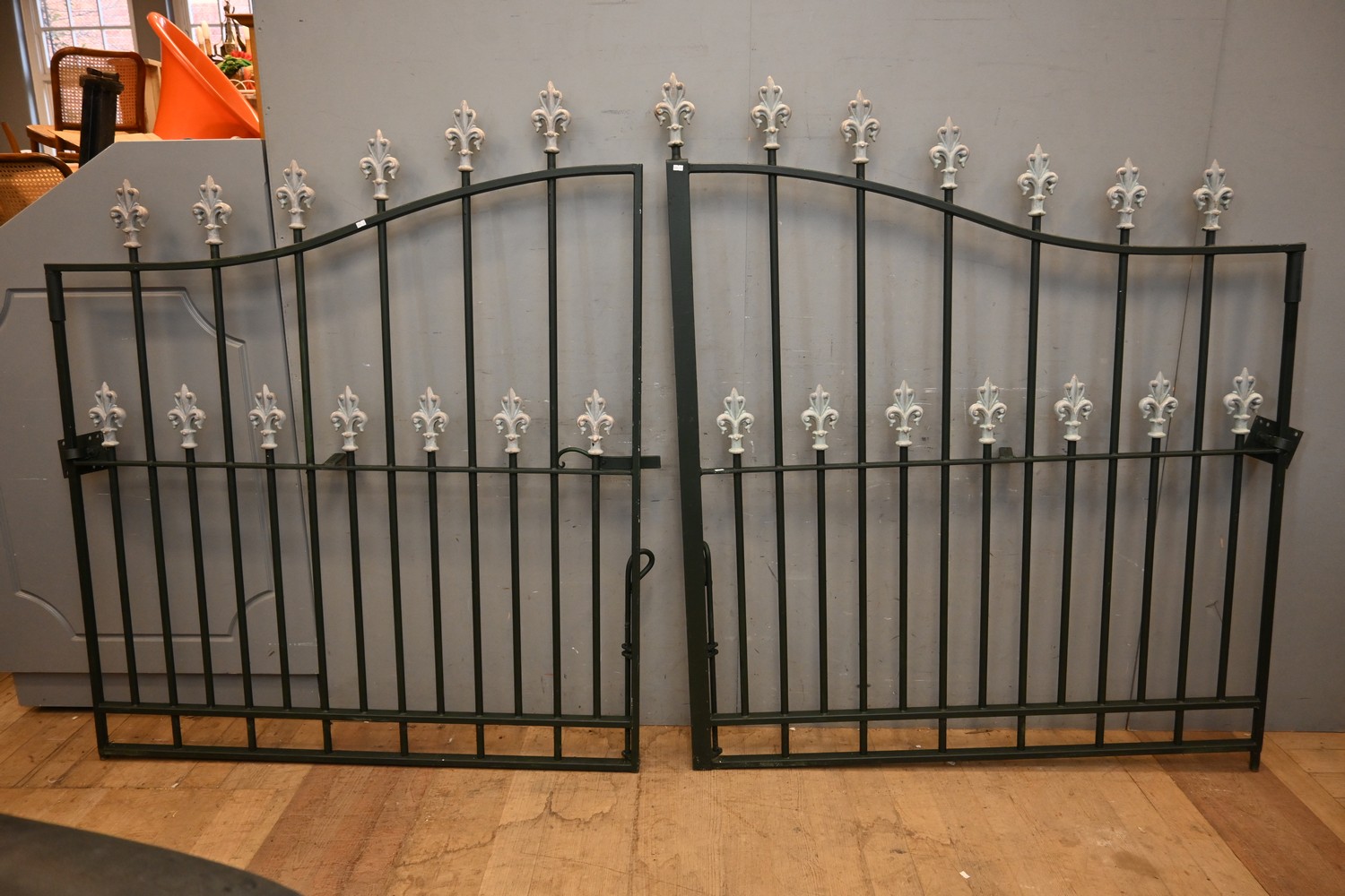A LARGE PAIR OF PAINTED IRON GATES (174H X 296W CM) (PLEASE NOTE THIS HEAVY ITEM MUST BE REMOVED BY CARRIERS AT THE CUSTOMER'S EXPENSE. LEONARD JOEL STAFF CANNOT ASSIST CARRYING THIS ITEM) (X-LARGE ITEM)