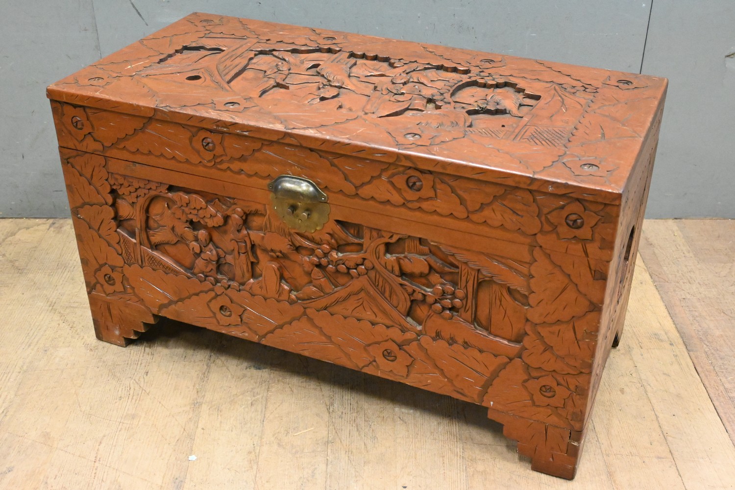 A DECORATIVELY CARVED CAMPHORWOOD CHEST (A/F) (50H X 89W X 43D CM) (LEONARD JOEL DELIVERY SIZE: LARGE)