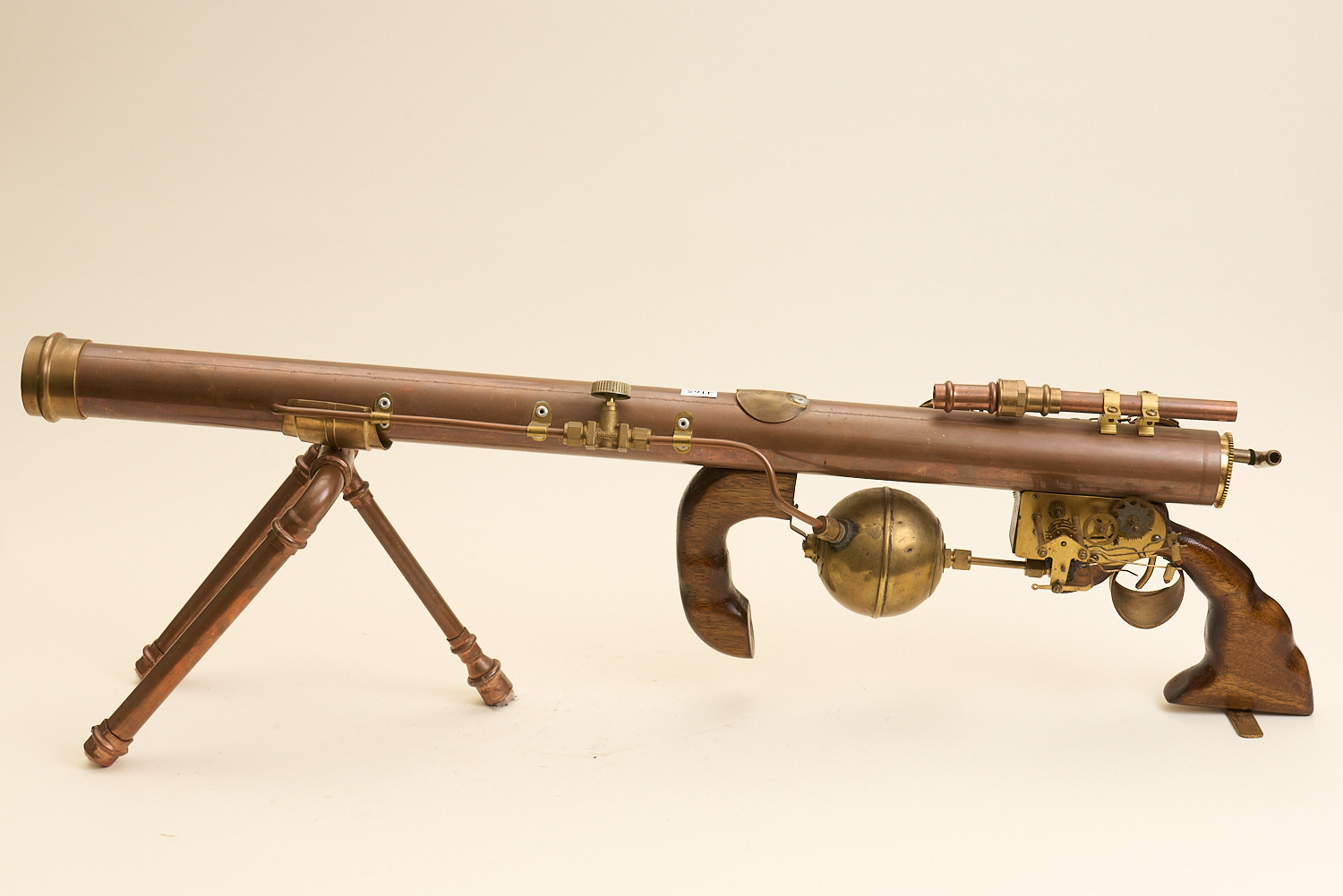 AN ARTISANAL STEAM PUNK COPPER AND BRASS MODEL GUN ON STAND L.96CM, LEONARD JOEL LOCAL DELIVERY SIZE: MEDIUM