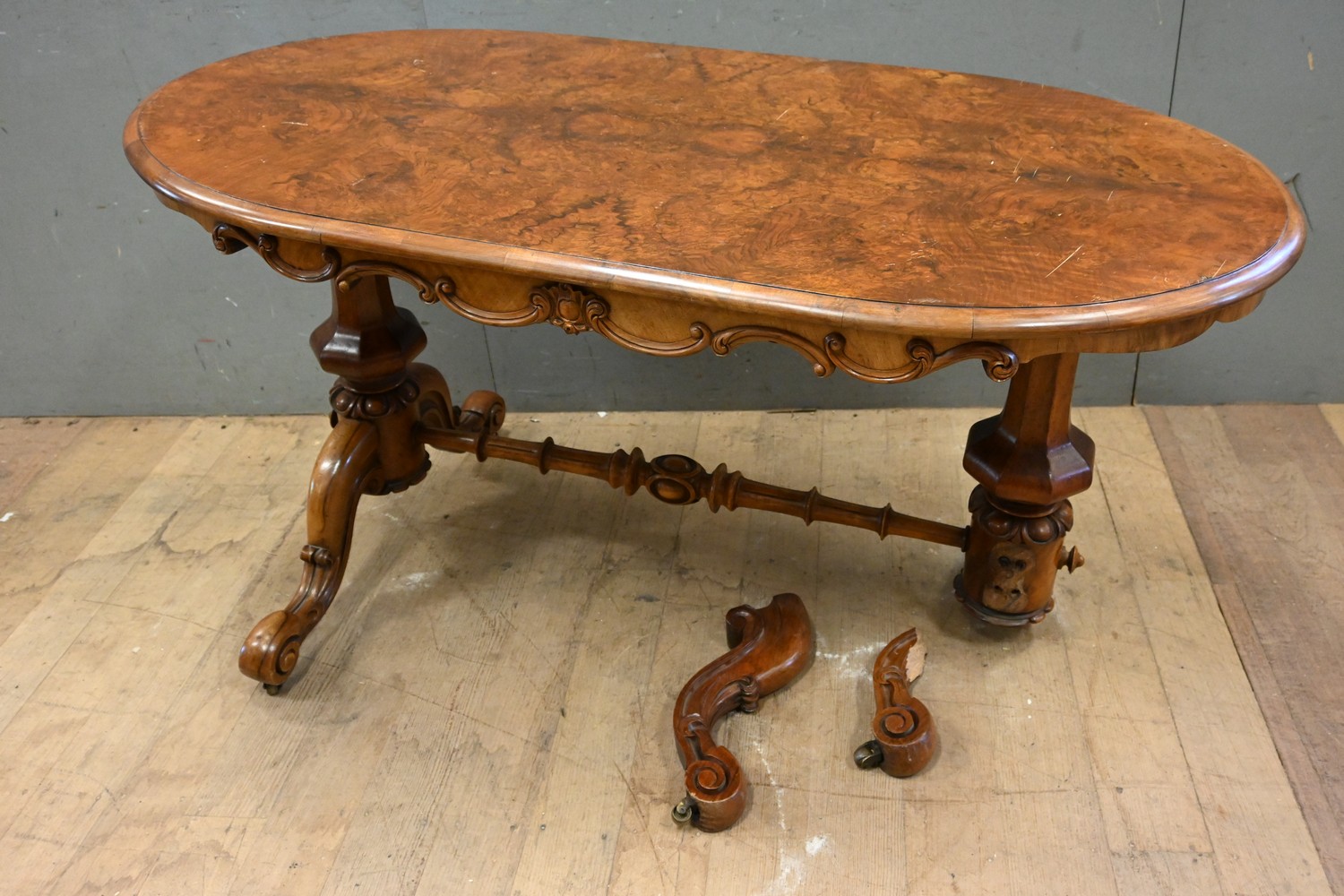 A VICTORIAN WALNUT CENTRE TABLE (A/F) (BROKEN LEGS, NEEDS REPAIR) (75H X 134W X 67D CM) (LEONARD JOEL DELIVERY SIZE: LARGE)