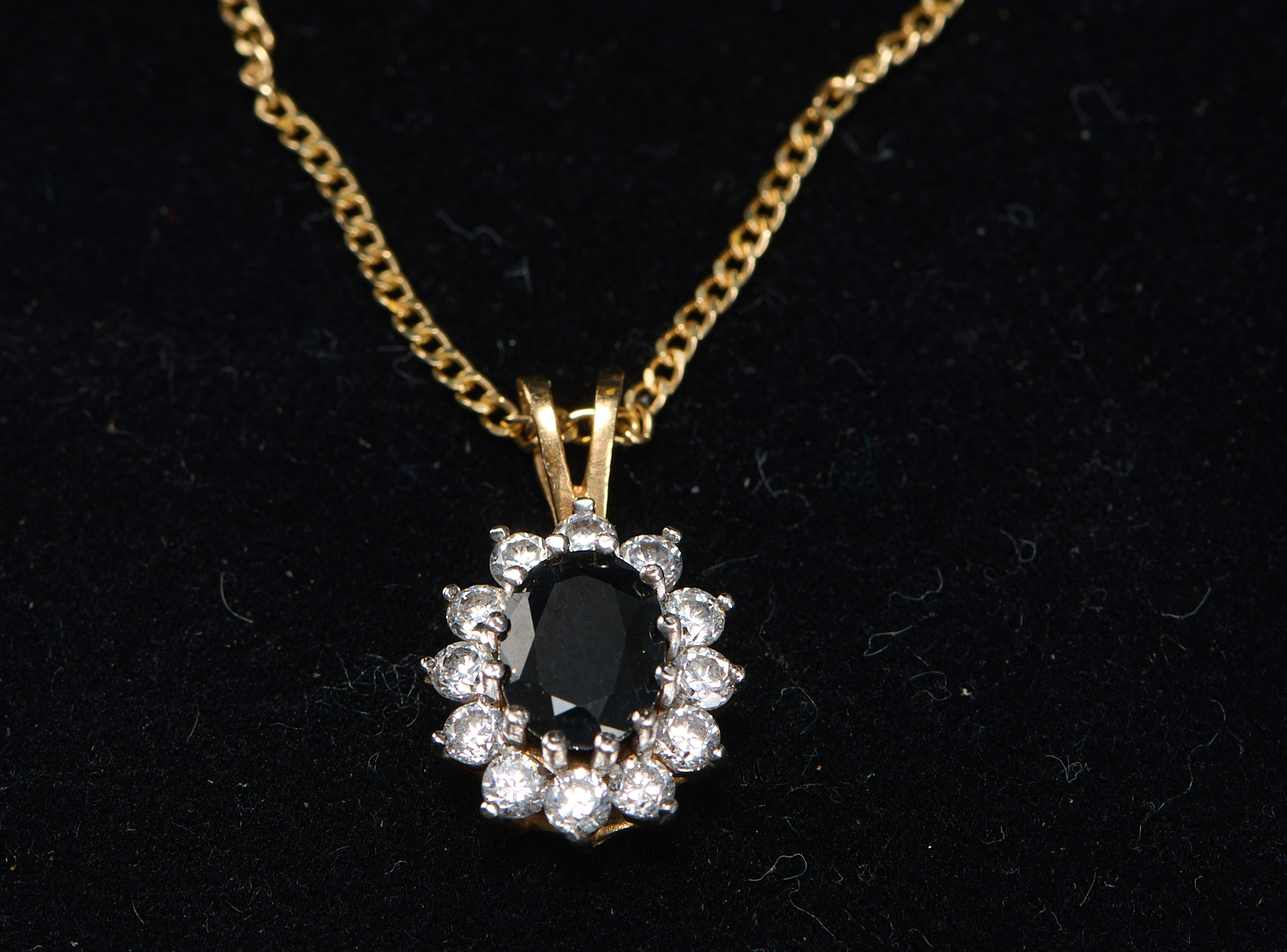 A VINTAGE SAPPHIRE AND CUBIC ZIRCONIA SET PENDANT TO A FINE CHAIN IN 9CT GOLD, 4.1GMS