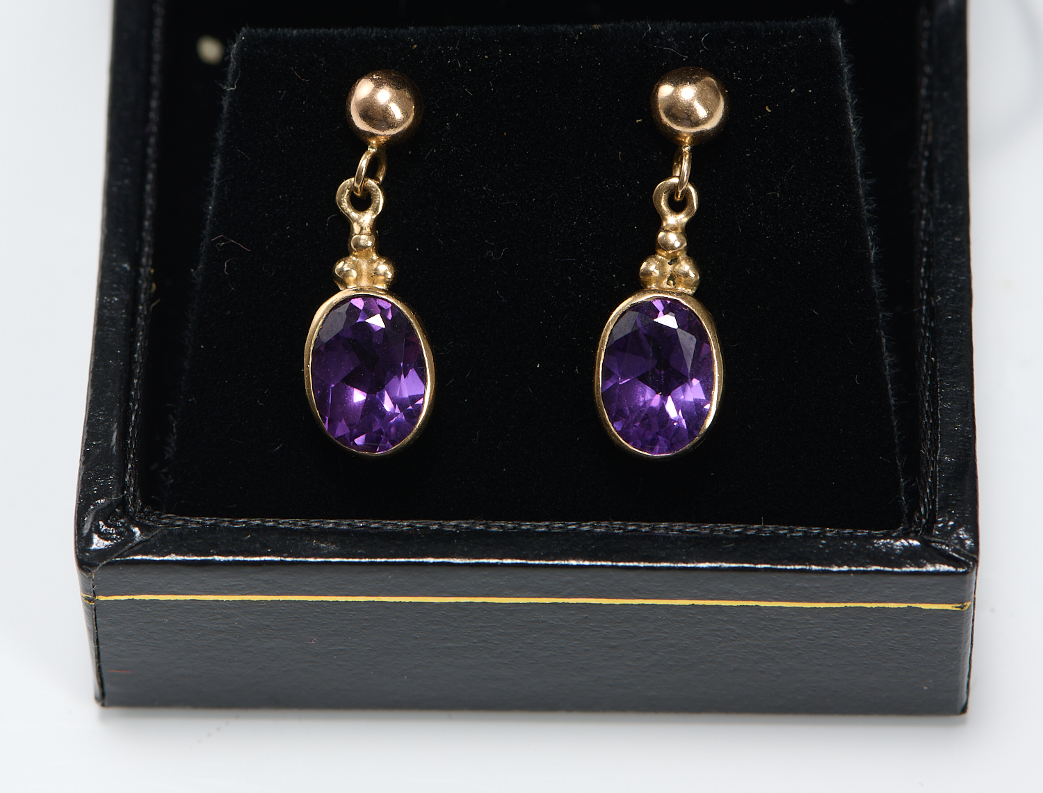 A PAIR OF AMESTHYST SET DROP EARRINGS IN 9CT GOLD, TO POST AND BUTTERFLY FITTINGS, 1.7GMS