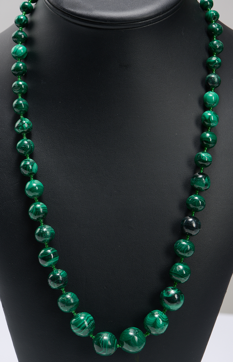 A STRAND OF GRADUATED MALACHITE BEADS, TO A BARREL CLASP, TOTAL LENGTH APPROXIMATELY 619MM