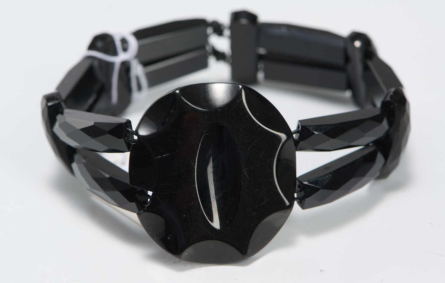 A VICTORIAN FRENCH JET EXPANDING BRACELET, THE CENTRAL OVAL JET PENDANT MEASURING 36 X 34MM