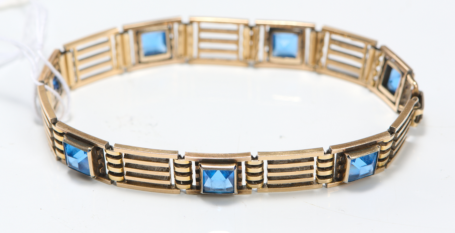 A BLUE PASTE SET BRACELET IN GOLD LINED METAL, TOTAL LENGTH APPROXIMATELY 75MM
