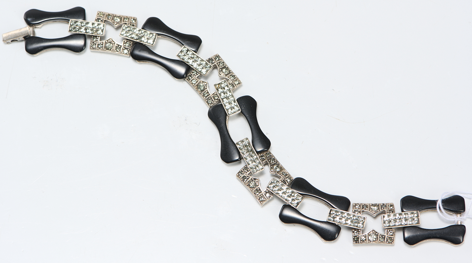 A VINTAGE FAUX ONYX AND PASTE SET BRACELET IN STERLING SILVER, TOTAL LENGTH APPROXIMATELY 185MM