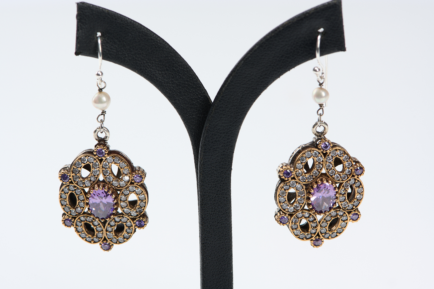 A PAIR OF PASTE AND CULTURED PEARL SET EARRINGS IN SILVER TO STERLING SILVER SHEPHERDS HOOKS, LENGTH APPROXIMATELY 38MM FROM HOOK