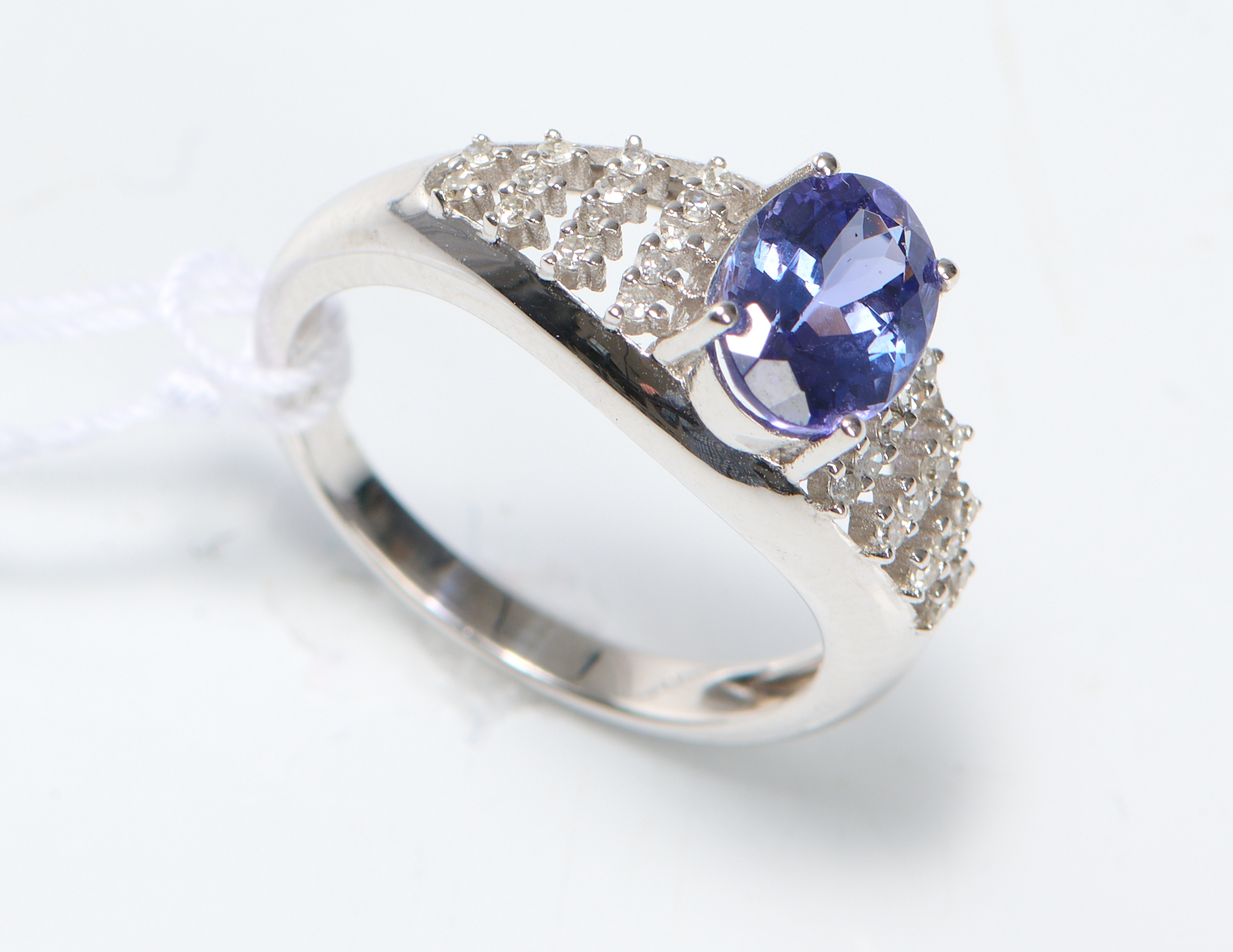 A TANZANITE AND DIAMOND RING IN 18CT WHITE GOLD, THE OVAL CUT TANZANITE MEASURING APPROXIMATELY 7.92MM X 5.75MM IN SETTING, SIZE K, 2.9GMS