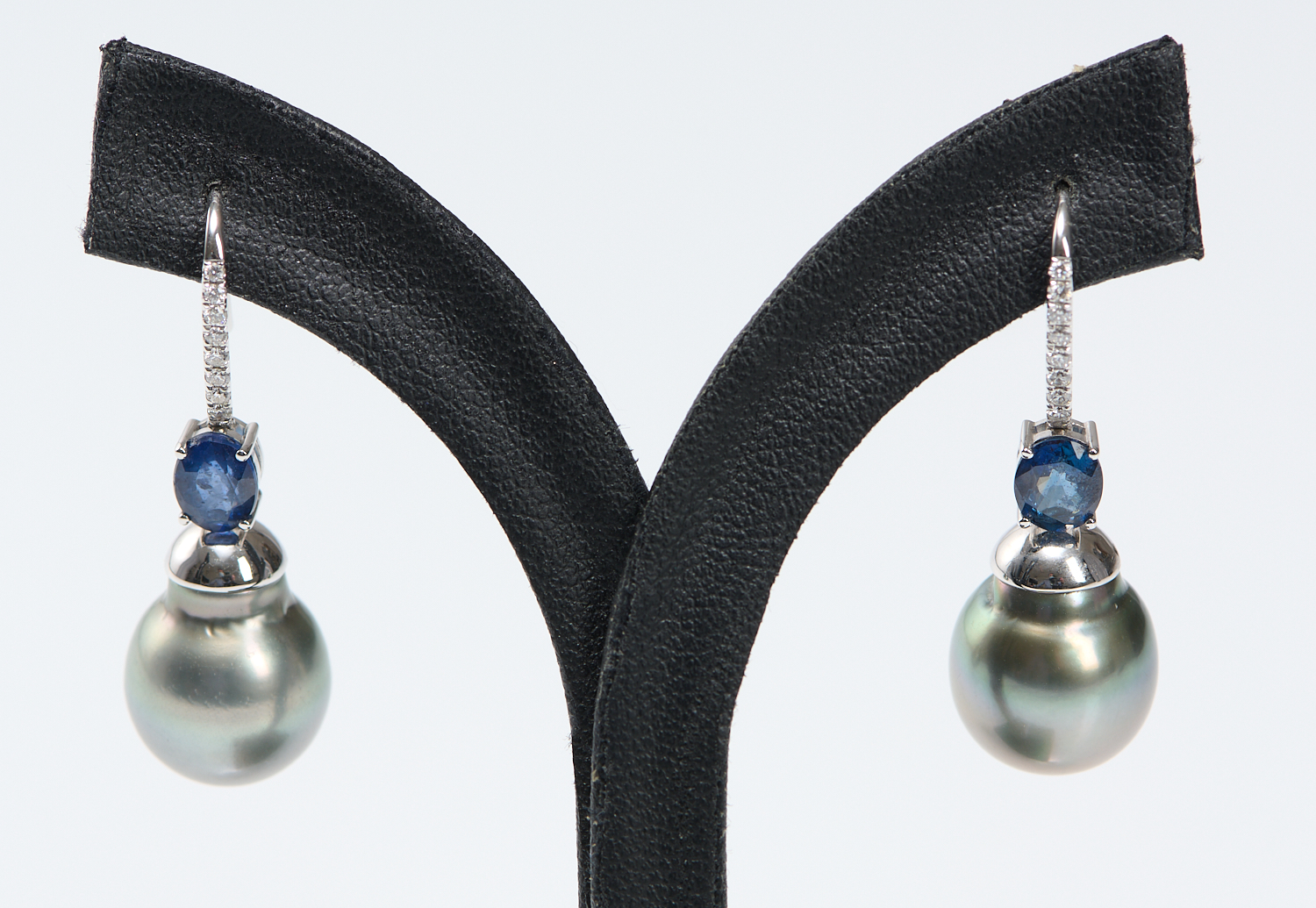 A PAIR OF TAHITIAN PEARL, SAPPHIRE AND DIAMOND EARRINGS IN 18CT WHITE GOLD, DROP LENGTH APPROXIMATELY 34MM