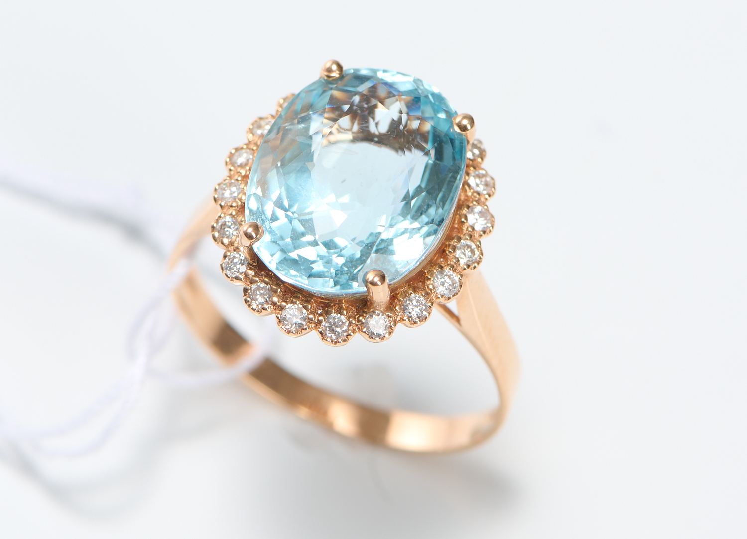 AN AQUAMARINE AND DIAMOND RING IN 18CT ROSE GOLD, THE OVAL CUT AQUAMARINE MEASURING APPROXIMATELY 12.97MM X 9.75MM IN SETTING, SIZE O, 3.4GMS