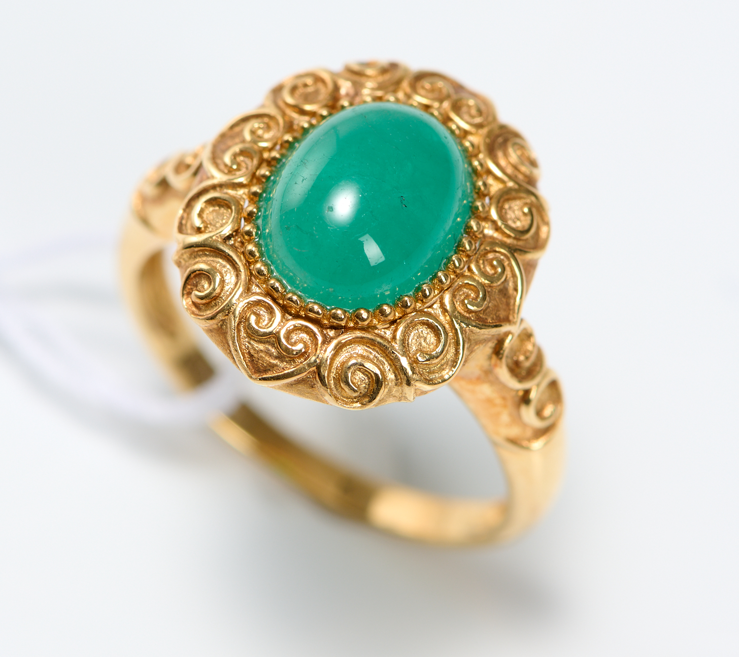 AN EMERALD AND DIAMOND RING IN 18CT GOLD, THE CABOCHON CUT EMERALD MEASURING APPROXIMATELY 10.04MM X 8.01MM IN SETTING, SIZE M, 4.0GMS