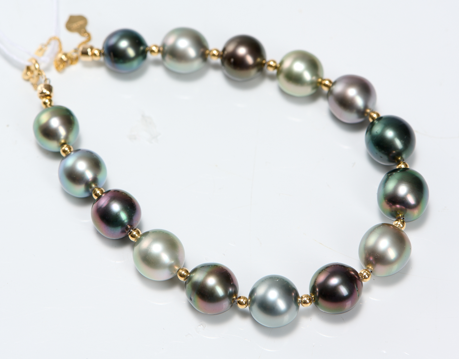 A TAHITIAN PEARL AND 18CT GOLD BEAD BRACELET, THE PEARLS MEASURING APPROXIMATELY 9.74MM IN DIAMETER, LENGTH 220MM