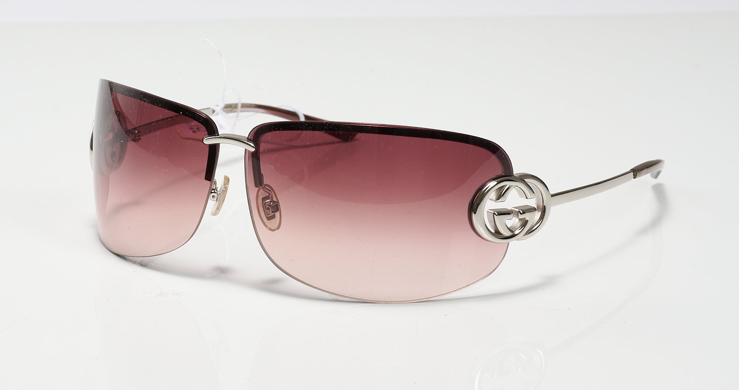 A PAIR OF SUNGLASSES BY GUCCI - Featuring a frame in silver toned metal, brown gradient lenses, and GG temple accents.