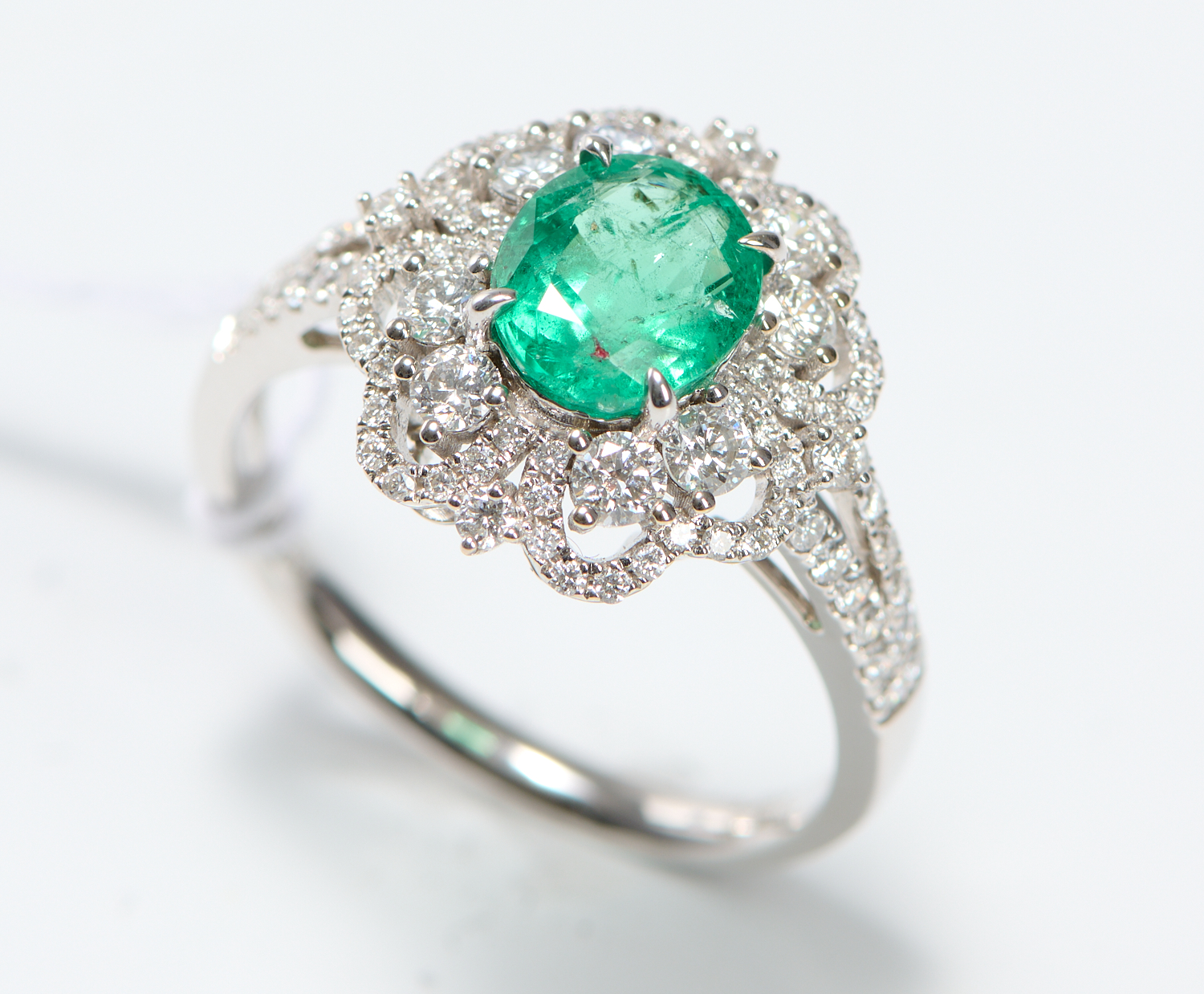 AN EMERALD AND DIAMOND RING IN 18CT WHITE GOLD
