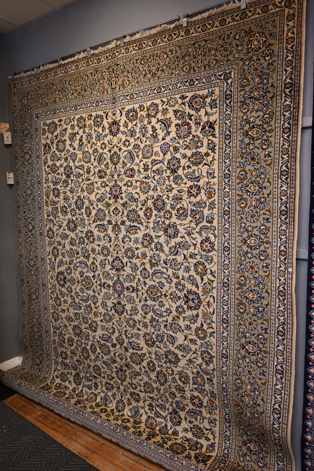 A PERSIAN CREAM KASHAN CARPET. WITH 100% WOOL PILE VERY SOLID AND DENSELY HAND KNOTTED IN TRADITIONAL DESIGN OF ALL OVER SHA ABBASI PALMETTES IN TONES OF CHAMPAGNE AND FRENCH BLUE. KASHAN CARPETS ARE WELL RENOWNED FOR THEIR LONGEVITY AND CONSIDERED AS MOST HARD WEARING OF ALL PERSIAN RUGS. CONDITION IS EXCELLENT. KASHAN CARPETS ARE HIGHLY RATED AND ARE STILL THE MOST POPULAR OF ALL PERSIAN RUGS. SIZE: 422 X 295 CM ORIGIN: PERSIA - RRP: $6,900 DOCUMENTATION OF AUTHENTICITY INCLUDED.