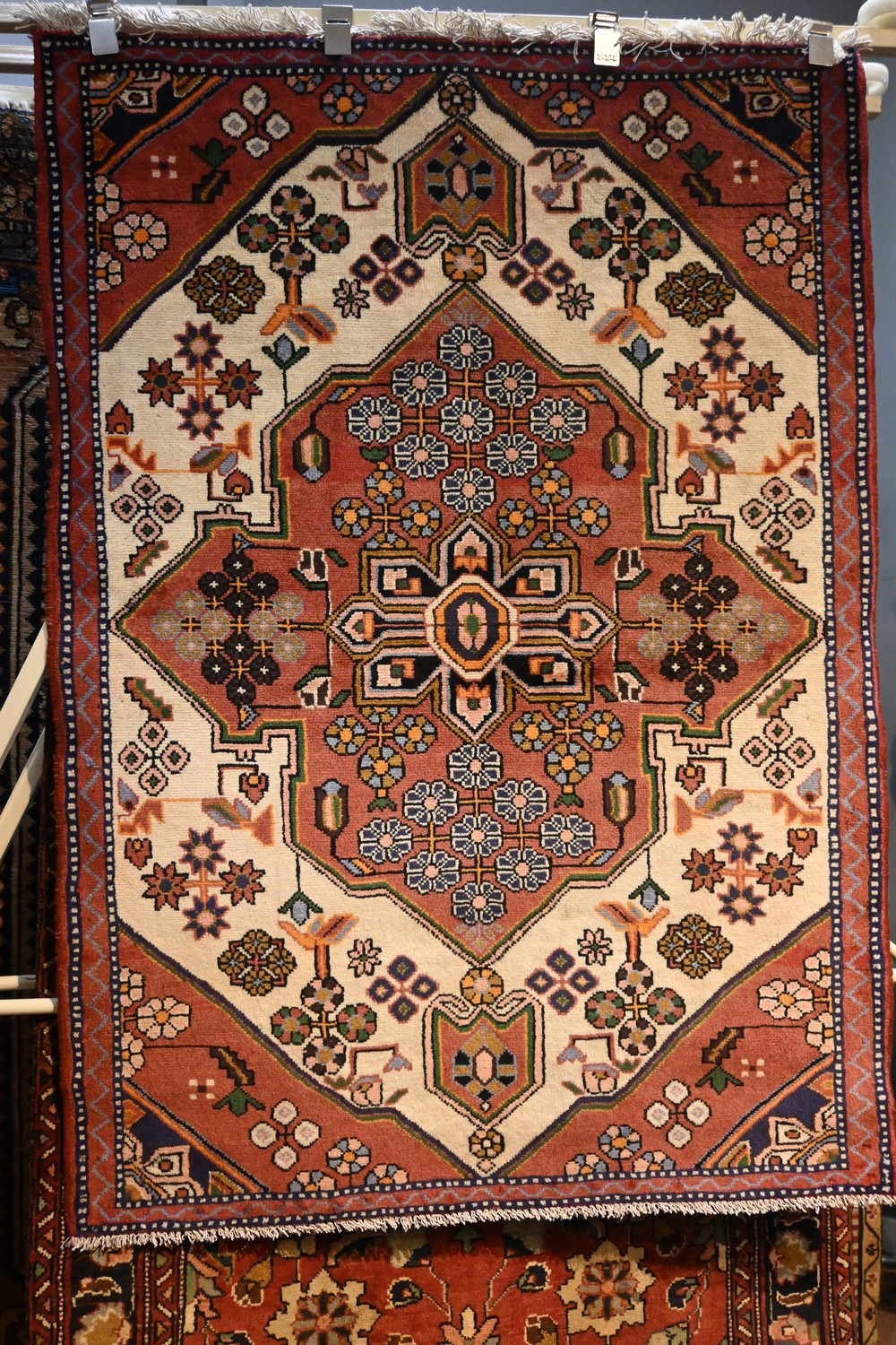 A PERSIAN NAHAVAND RUG. 100% WOOLLEN PILE AND 100% NATURAL DYES. FINELY HAND-KNOTTED VILLAGE WEAVE WITH RARE DESIGN OF STYLIZED MEDALLION ON A CREAM FIELD SET WITHIN A FIELD OF VARYING TRIBAL FLORAL PATTERNS. ALSO COMPRISING OF SAGE GREEN AND TERRACOTTA & SOFT PINK TONES THROUGH OUT THE FIELD. SIZE: 150 X 107 CM ORIGIN: PERSIA - RRP: $1,200 DOCUMENTATION OF AUTHENTICITY INCLUDED.