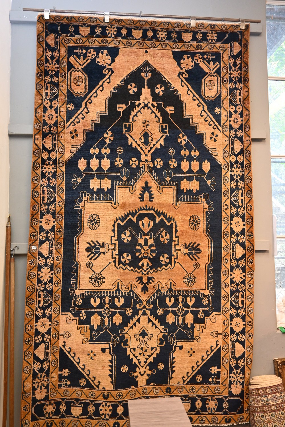 A MAGNIFICENT CIRCA 1950'S PERSIAN TAJABAD (CROWN VILLAGE) NOMADIC RUG. 100% WOOL PILE, NATURAL DYES. A BOLD DOUBLE ANCHOR DOMINANT TALL MEDALLION SURROUNDED WITH GEOMETRICAL FLORAL MOTIFS FROM THE CENTRE TO THE OUTER BORDER. IN BEAUTIFUL TONES OF DEEP PERSIAN INDIGO BLUE AND TERRACOTTA. IN GALLERY CONDITION. SIZE: 281 X 155 CM ORIGIN: PERSIA. RRP: $3,800 DOCUMENTATION OF AUTHENTICITY INCLUDED.