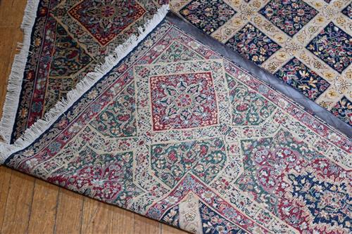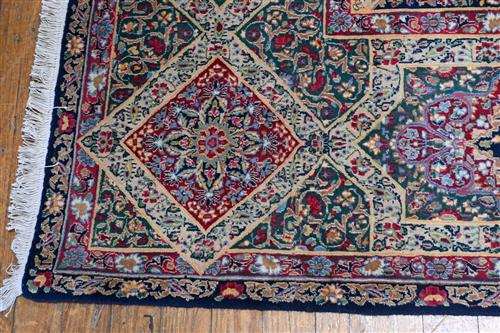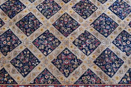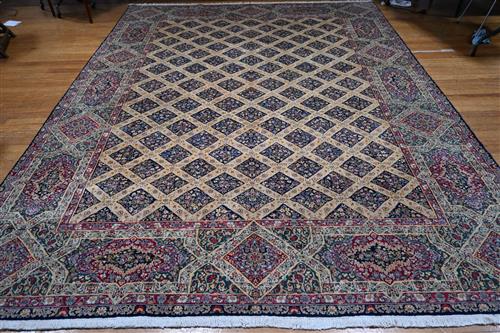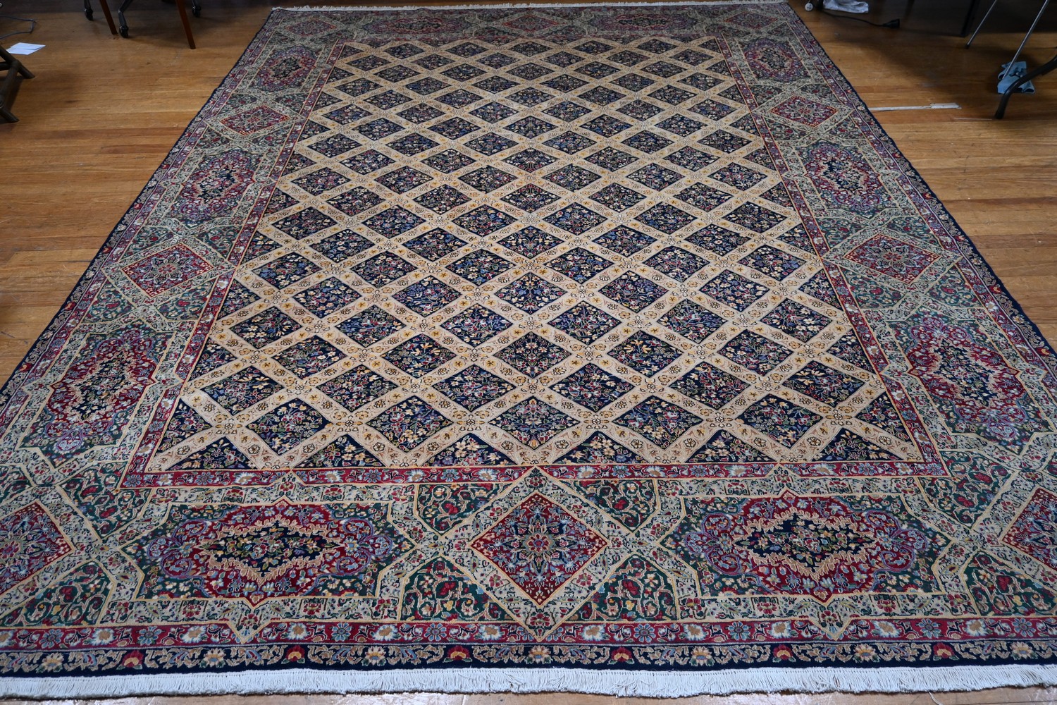 AN EXCEPTIONALLY CHERISHED RAVAR KERMAN GRAND CARPET. HAND WOVEN WITH THE FINEST WOOLLEN PILE CIRCA 1970S. A VERY COLLECTABLE AND HARD TO SOURCE EXAMPLE OF SUCH MASTERPIECE WITH APPROXIMATELY 600,000 INDIVIDUAL KNOTTS PSQM. KERMAN CARPETS ARE ONE THE MOST INCREDIBLY BEAUTIFUL EXAMPLES OF HANDKNITTED CARPETS, AND THEY ARE HANDMADE TREASURES OF THE ART & THE CRAFT OF THE PERSIAN KNOT, ALSO ARE CHERISHED AND RESPECTED WORLDWIDE. A SUPERB BALANCE OF COLOURS THROUGHOUT COMPRISING OF THE MOST INTRICATE AND COMPLEX MULTIPLE DIAMOND MOTIFS ALL OVER IN TONES OF PERSIAN INDIGO BLUE, GOLD, CRIMSON AND EMERALD GREEN. THE FINER KERMAN CARPETS ARE RENOWNED FOR THEIR DURABILITY AND INVESTMENT QUALITY. EX-GALLERY RUG FIRST TIME OFFERED IN A MAGNIFICENT CONDITION FOR THE AGE WITH A MILD SEMI VINTAGE PILE. SIZE: 400 X 296 CM ORIGIN: PERSIA - RRP: $28,000 DOCUMENTATION OF AUTHENTICITY INCLUDED