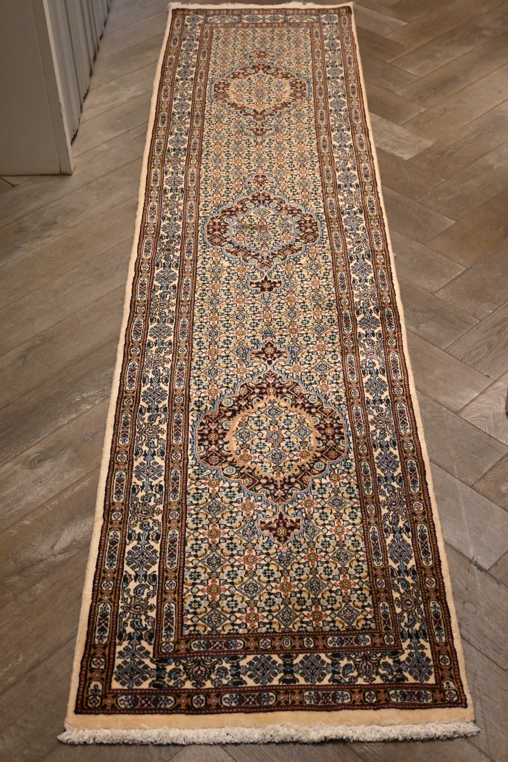 A VERY INTRICATE PRISTINE FINELY HAND-KNOTTED BRAND-NEW PERSIAN BIRJAND MOOD HALL RUNNER 100% LAMBS WOOL WITH SILK INLAYS. SOLID & DENSE PILE. CLASSIC MOOD DESIGN OF CONTINUING SUNBURST MEDALLIONS IN A FIELD OF FLORAL HERATI MAHI PATTERNS. BORDER OF ROSETTES AND CARTOUCHE PATTERNS. WITH BEAUTIFUL TONNES OF BLUE, REDS AND LIGHT PINK. GREAT RUG FOR HIGH TRAFFIC AREAS. SIZE: 292X72CM. ORIGIN: IRAN - RRP: $4,500 DOCUMENTATION OF AUTHENTICITY INCLUDED