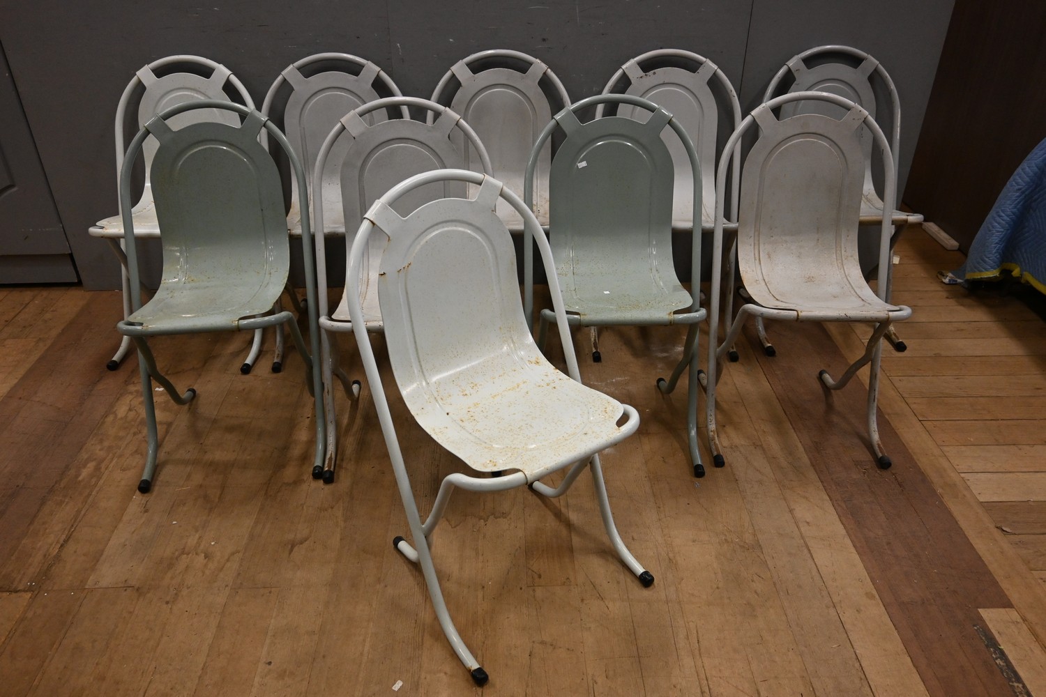 SET OF 10 STACKING CHAIRS IN GREY ENAMEL (A/F) (83H X 47W X 52D CM) (LEONARD JOEL DELIVERY SIZE: LARGE)