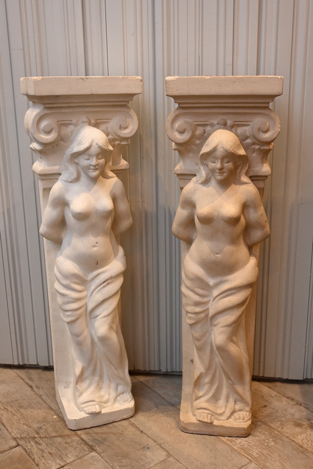 A PAIR OF LARGE RECONSTITUTED STONE FRENCH SEMI NAKED LADY FIGURAL ARCHITECTURAL CARVINGS (A/F) (98H X 28W X 23D CM) (PLEASE NOTE THIS HEAVY ITEM MUST BE REMOVED BY CARRIERS AT THE CUSTOMER'S EXPENSE. LEONARD JOEL STAFF CANNOT ASSIST CARRYING THIS ITEM) (X-LARGE ITEM)
