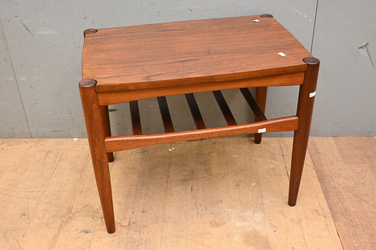 RETRO MID CENTURY AUSTRALIAN MADE TEAK REVERSIBLE TOP RECTANGULAR COFFEE TABLE WITH LOWER MAGAZINE RACK AND BULLET LEGS (A/F) (52H X 63W X 42D CM) (LEONARD JOEL DELIVERY SIZE: MEDIUM)
