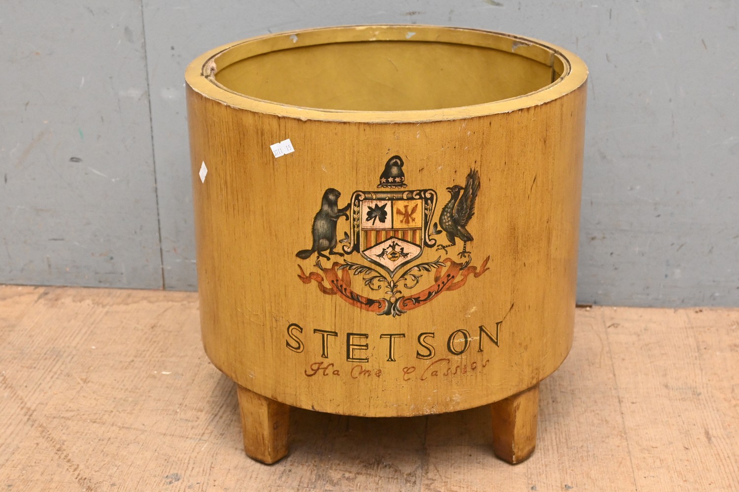 HAND PAINTED WOODEN STETSON CIRCULAR PLANTER POT – ORIGINALLY FROM GEORGES MELBOURNE (41H X 40 DIAMETER CM) (LEONARD JOEL DELIVERY SIZE: MEDIUM)